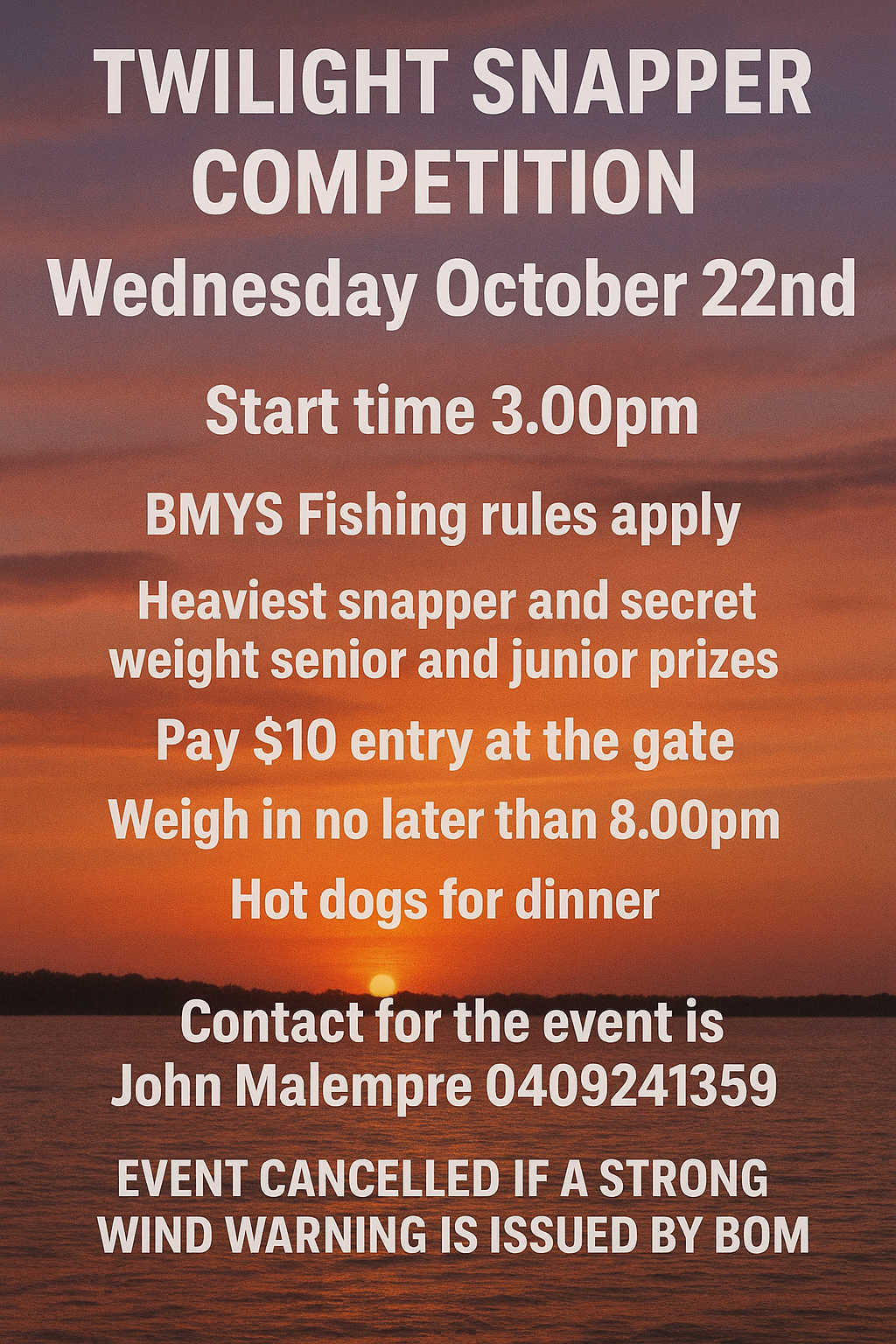 TEST Event. Twilight Snapper Fishing Competition. Don't miss this great afternoon comp and the chance to catch a big red.