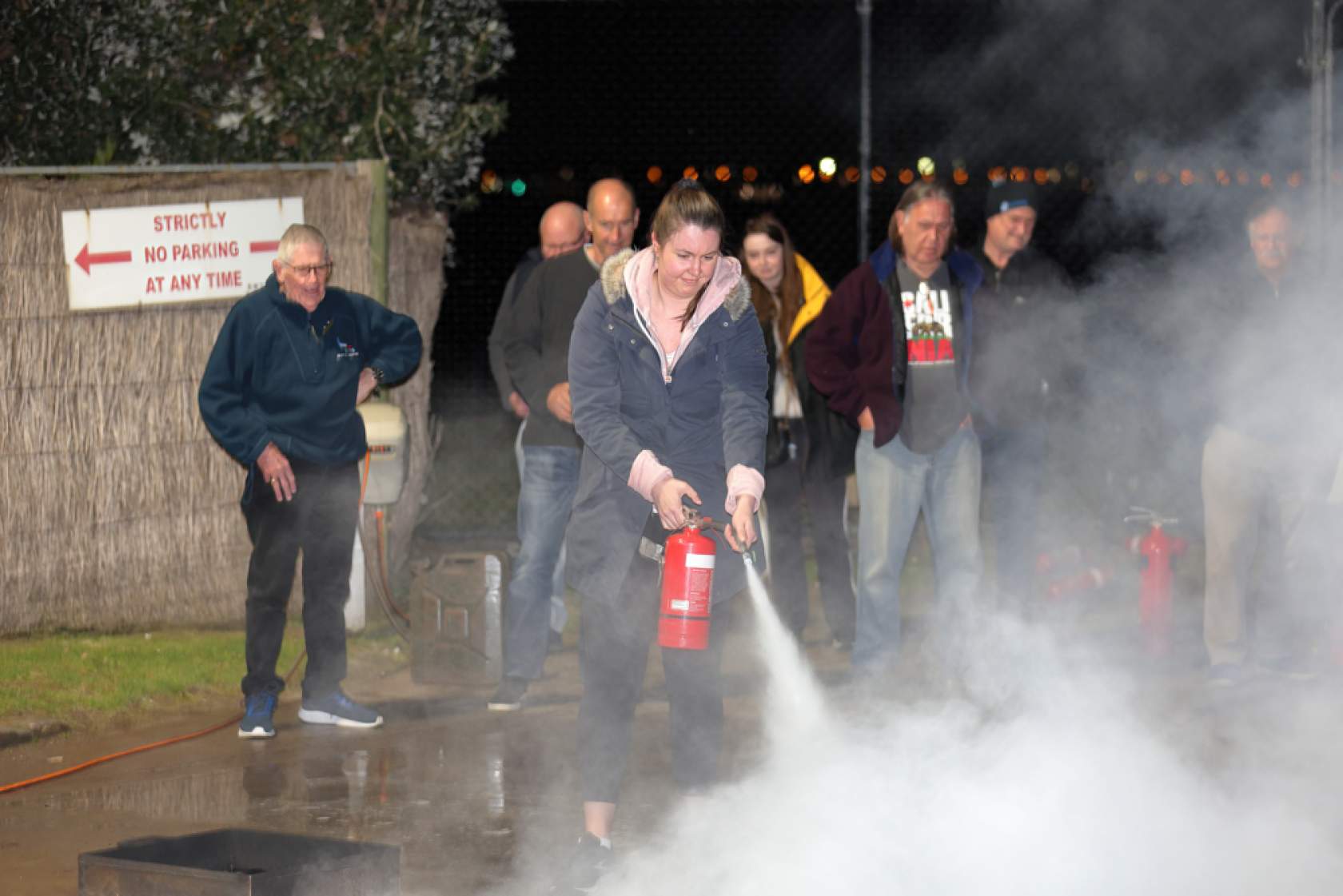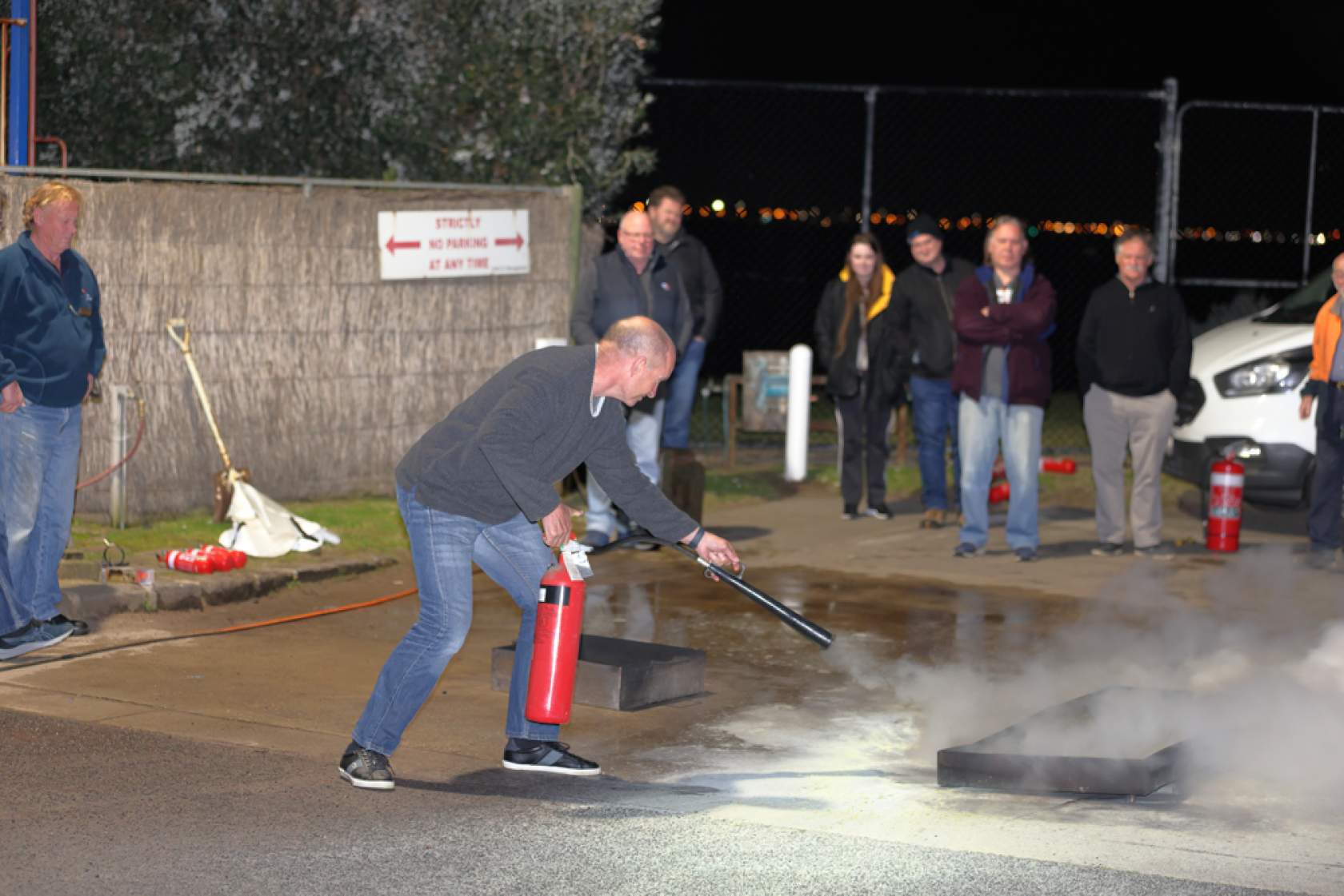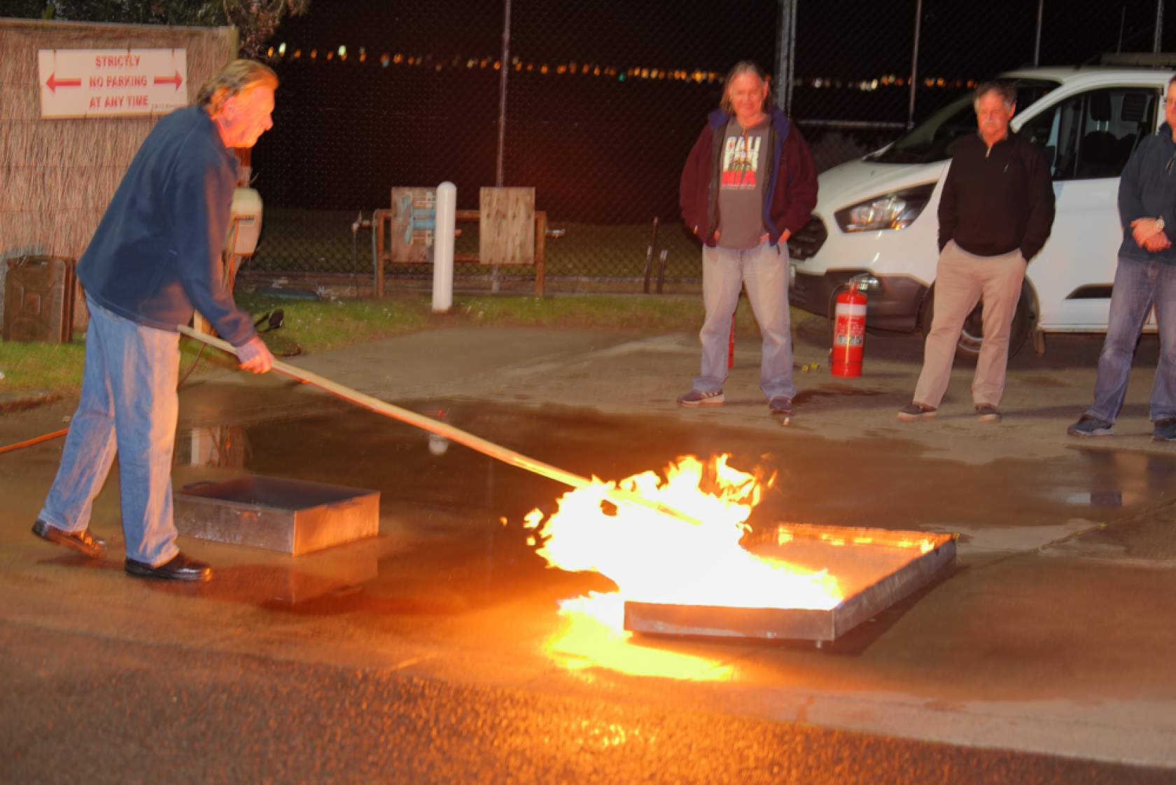 Peter demonstrated the effectiveness of various extinguisher types and sizes on small petrol fires at the rear of the Club. Attendees also had the opportunity to use extinguishers themselves and to assess their effectiveness.