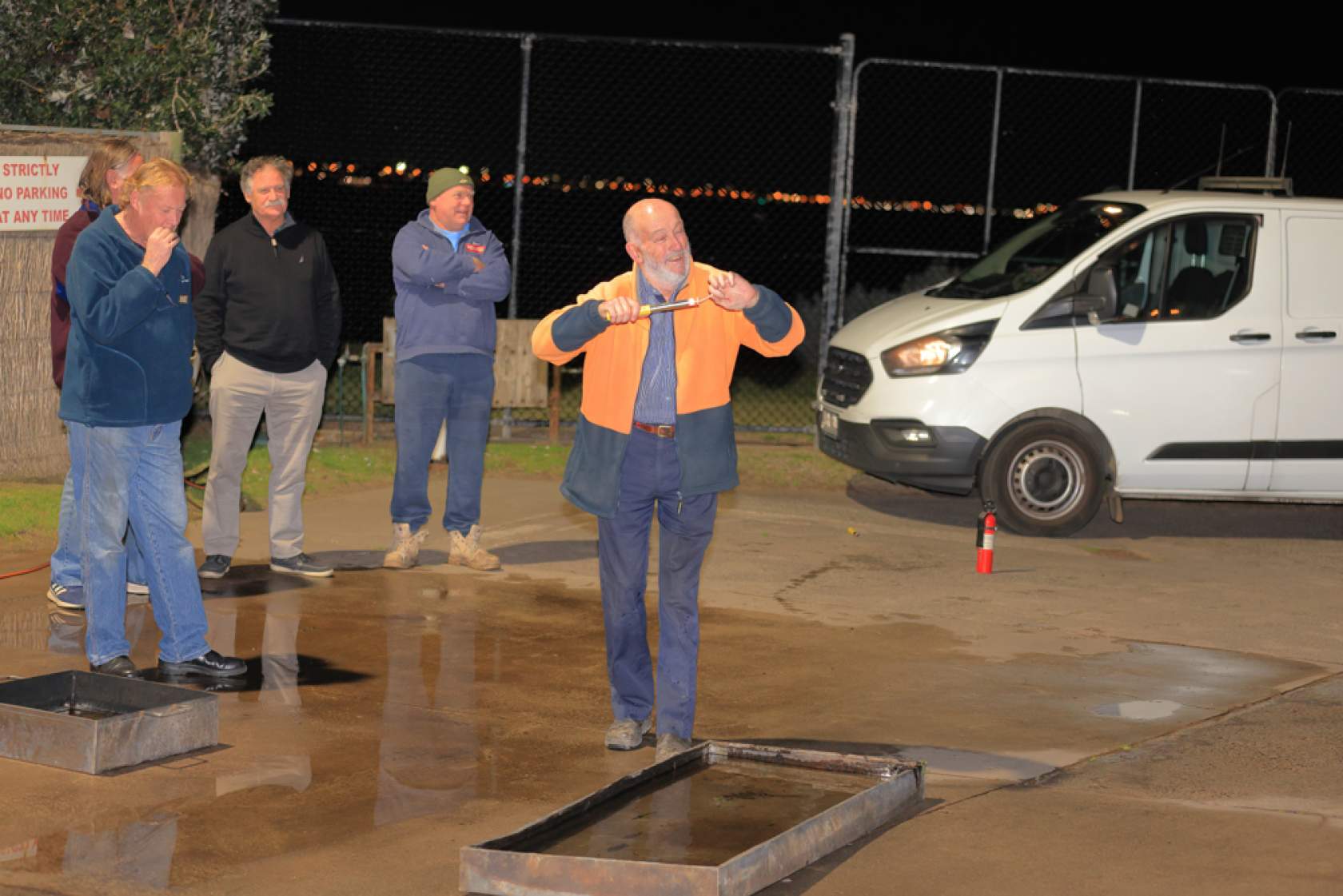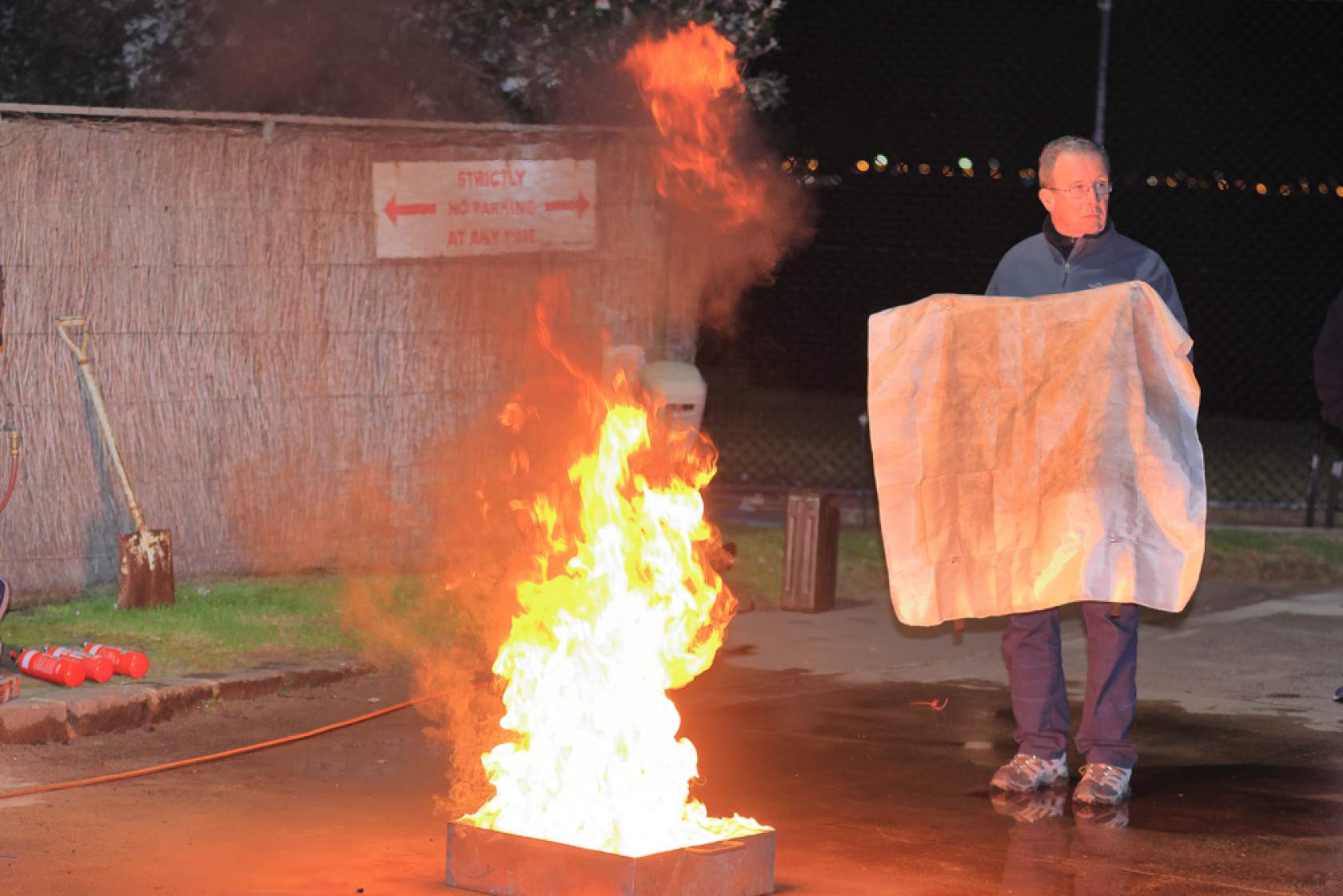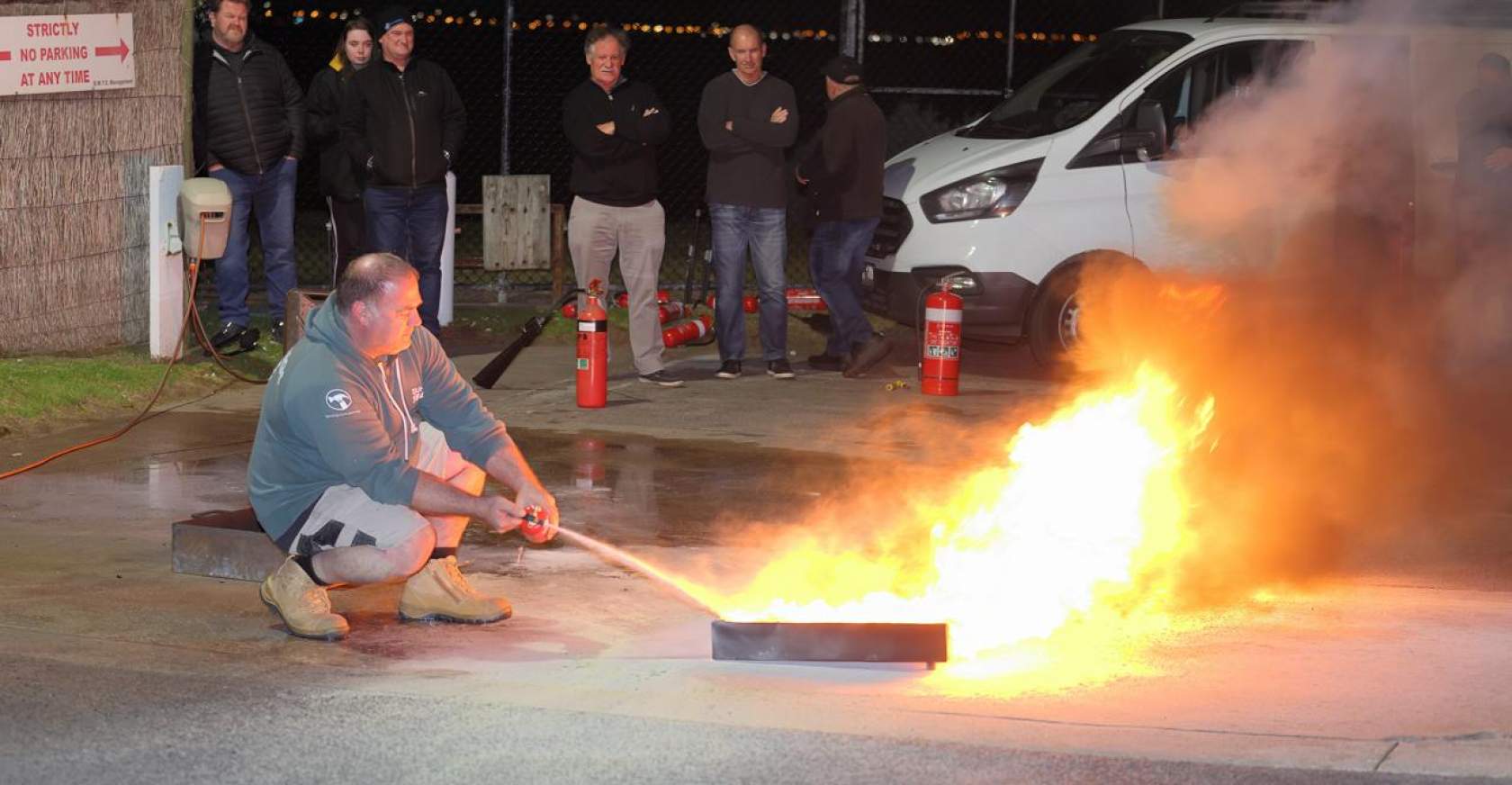 Peter demonstrated the effectiveness of various extinguisher types and sizes on small petrol fires at the rear of the Club. Attendees also had the opportunity to use extinguishers themselves and to assess their effectiveness.