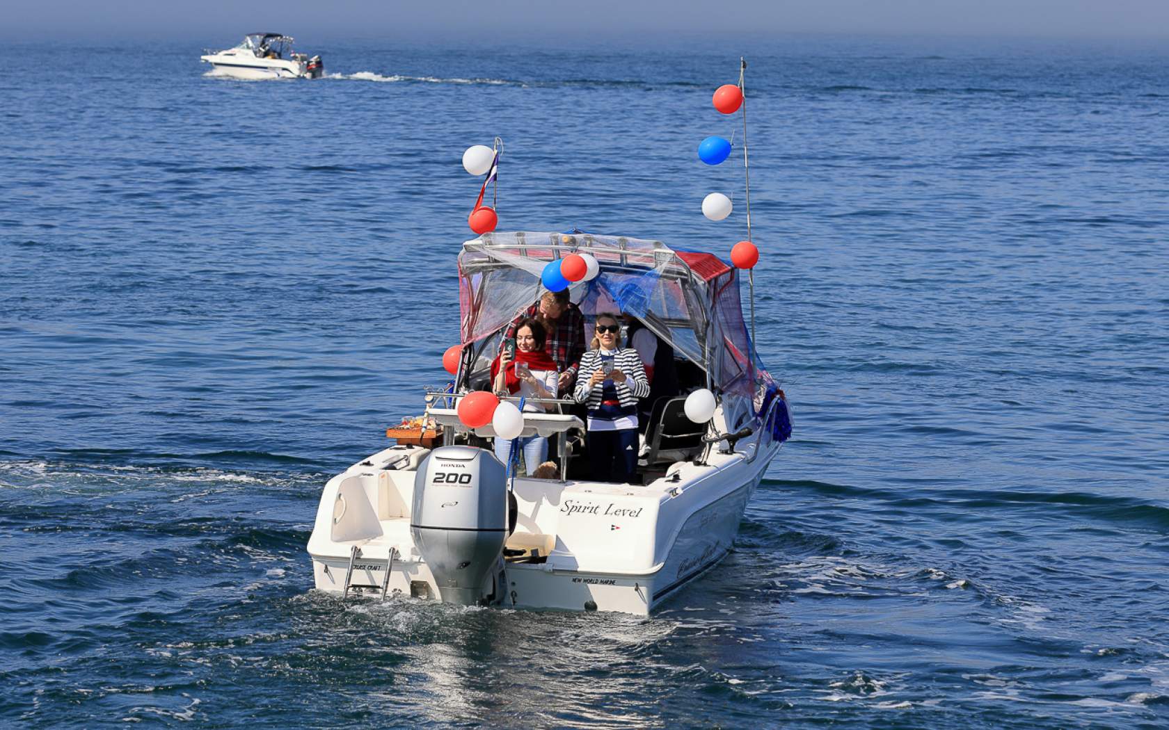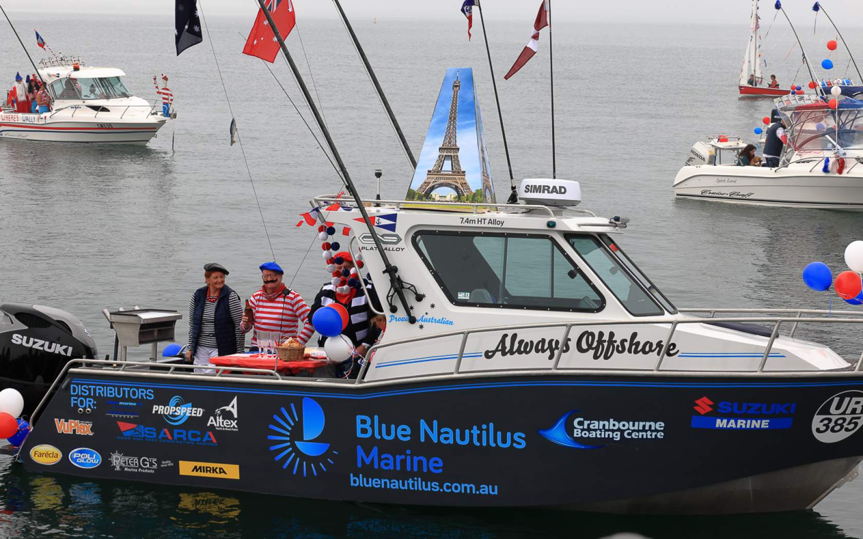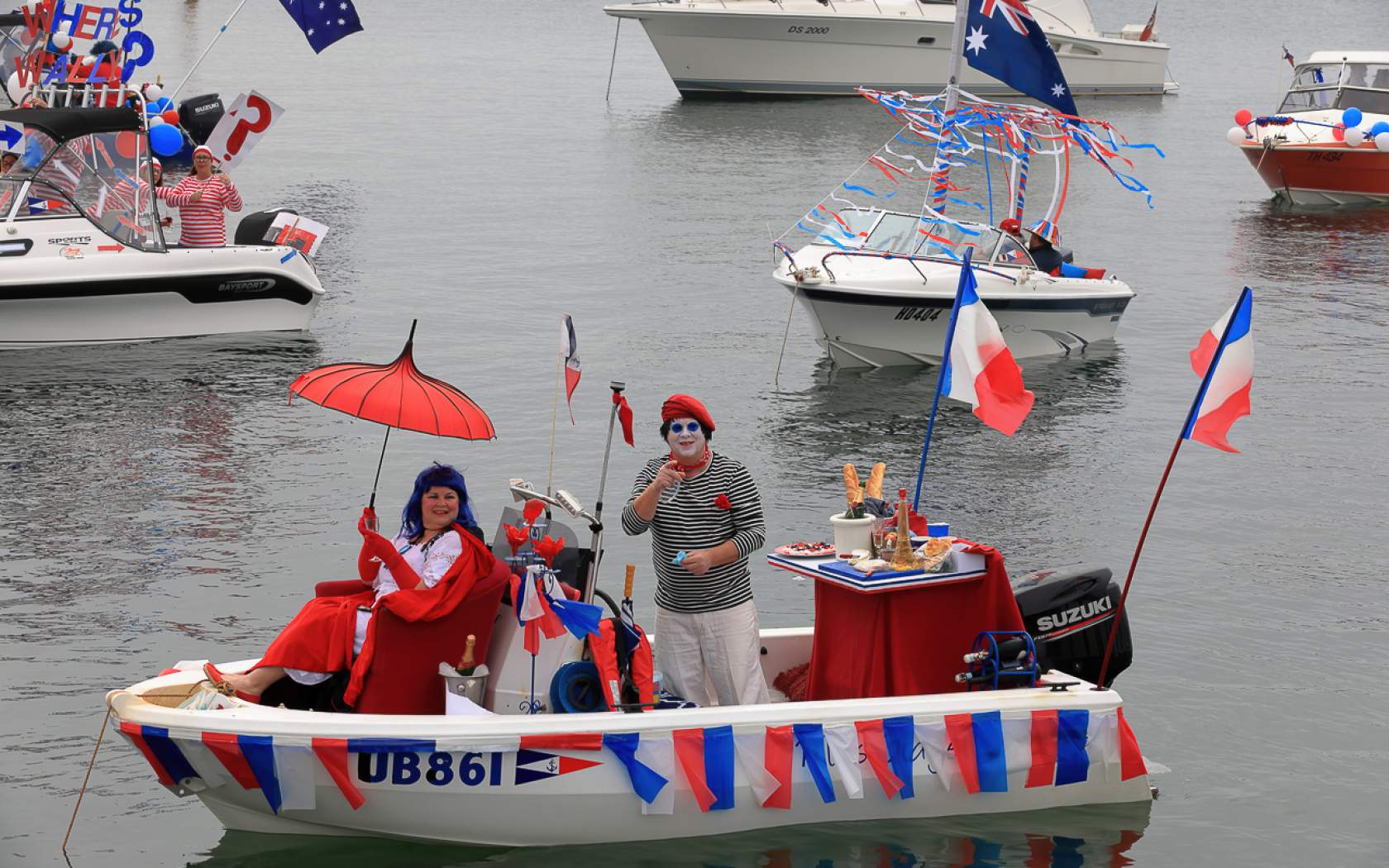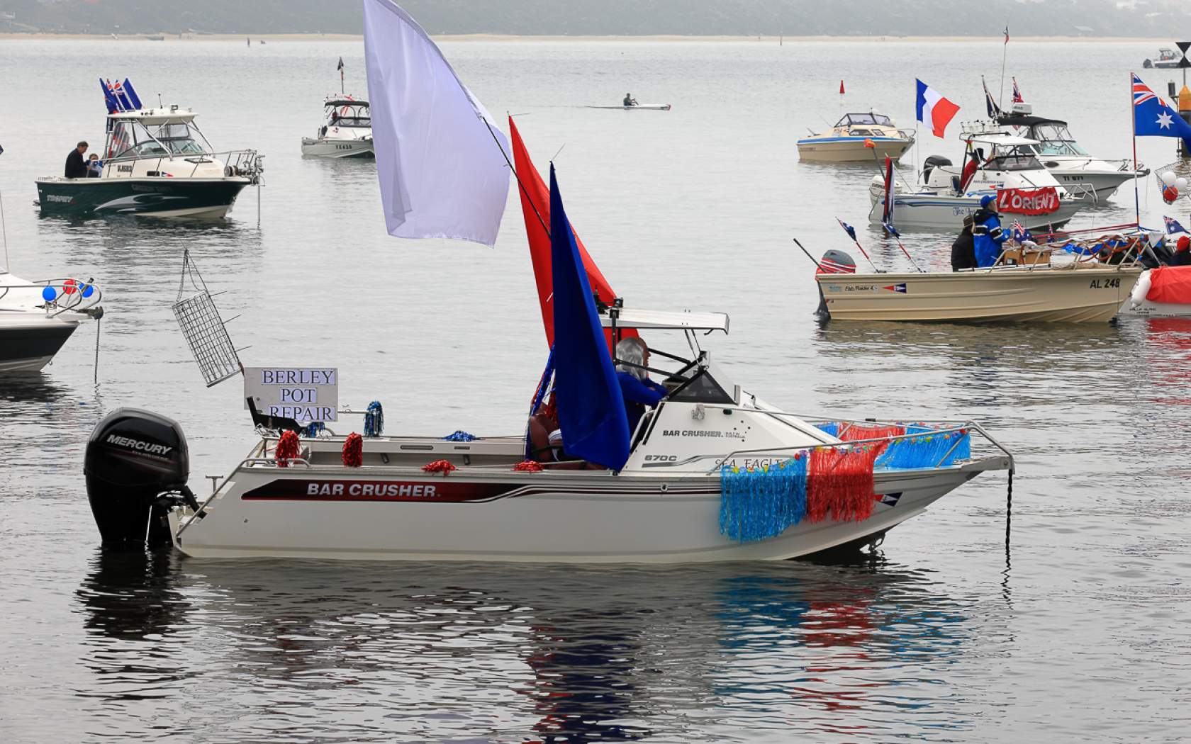 Over 40 boats took to the water to assemble near the Club jetty. The theme for the day was the BMYS Club colours Red, White and Blue. It was amazing to see the boats decorated in these colours and the costumes of the boat crews.